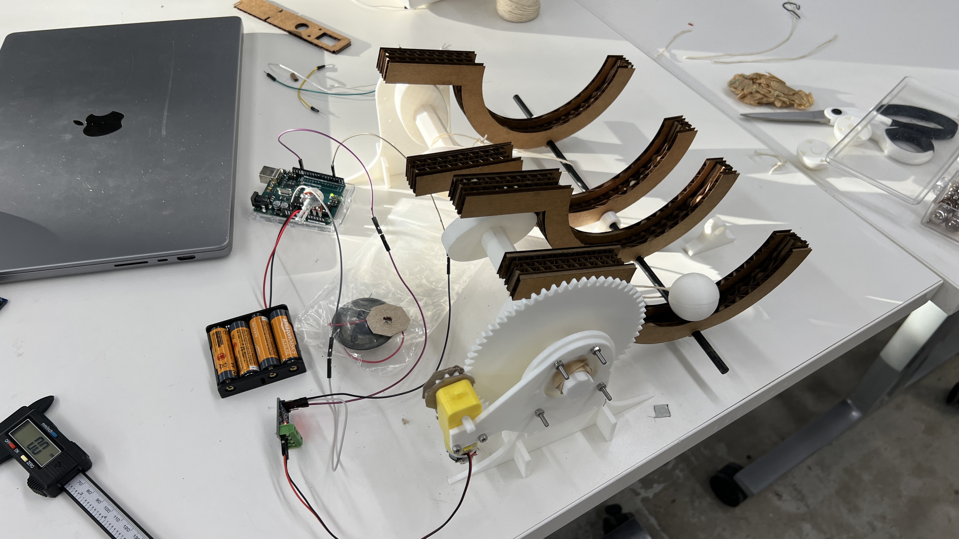 I decided to build a structure that moves small table tennis balls in mechanically programmable semi circles from side to side. My idea was to incorporate a gear reduction system that increases the torque output of the small electric motor and turns an octagonal camshaft. On the camshaft are small half ellipses that move the semi circles up and down. Since there are multiple of these semi circles they can move in mesmerizing ways e.g. in a sine curve. The ellipses can be moved by hand so the design can be changed very easily. A video of the working sculpture is on the microcontroller programming page, since I incorporated an Arduino to control the movement of the sculpture.